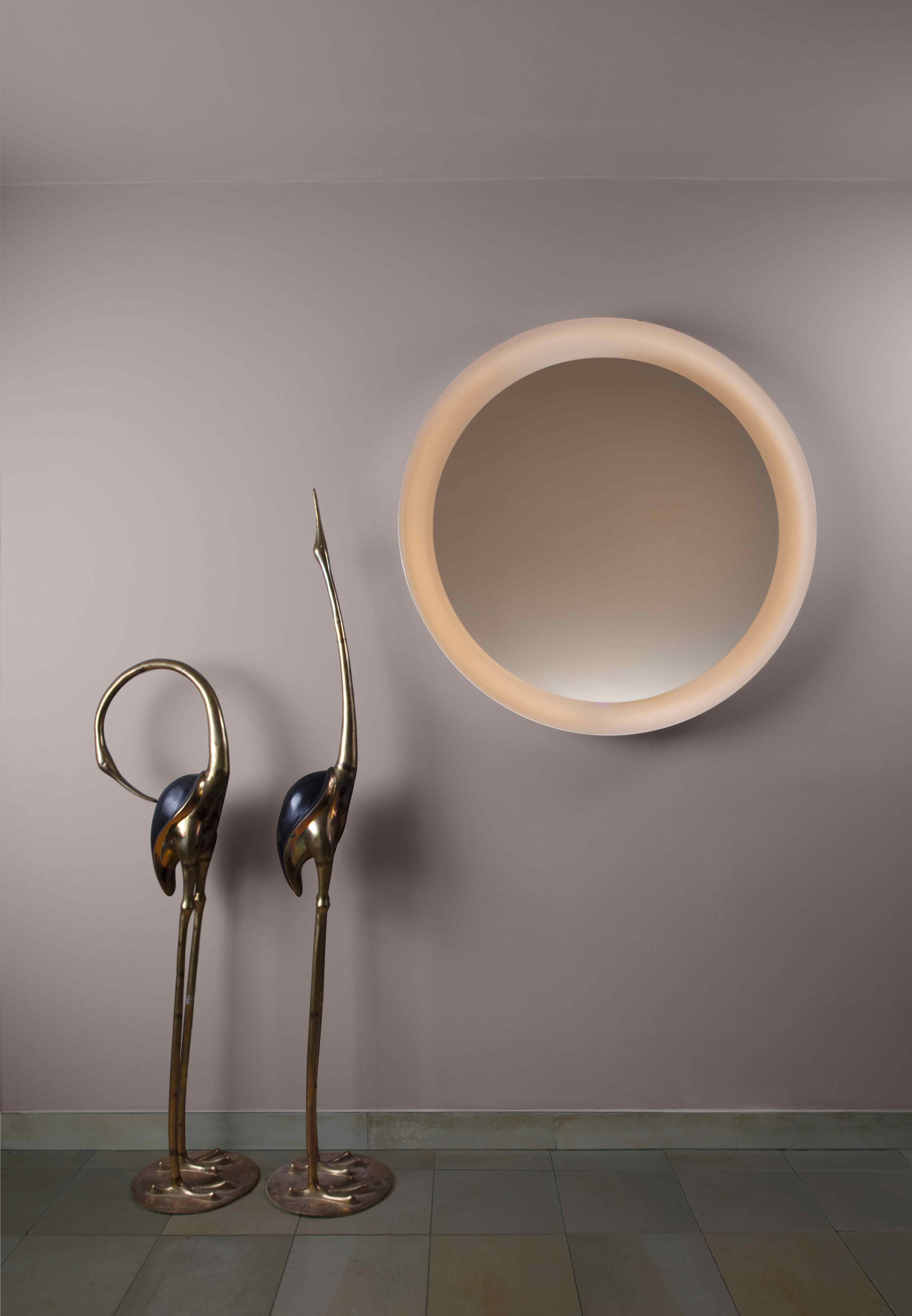 Die Spiegelleuchte mit 6 mm Kristallspiegel hat eine indirekte LED Ringbeleuchtung. Mit einem Dimmer-Schalter kann das Licht stufenlos geregelt werden. Der Betrachtende erstrahlt in völlig indirekter Ausleuchtung. Die hochwertige Herstellung findet in einer Leuchten-Manufaktur statt. Optimal im Beauty-Bereich als Schminkspiegel, im Friseur,- Theater,- oder Hotelbereich.